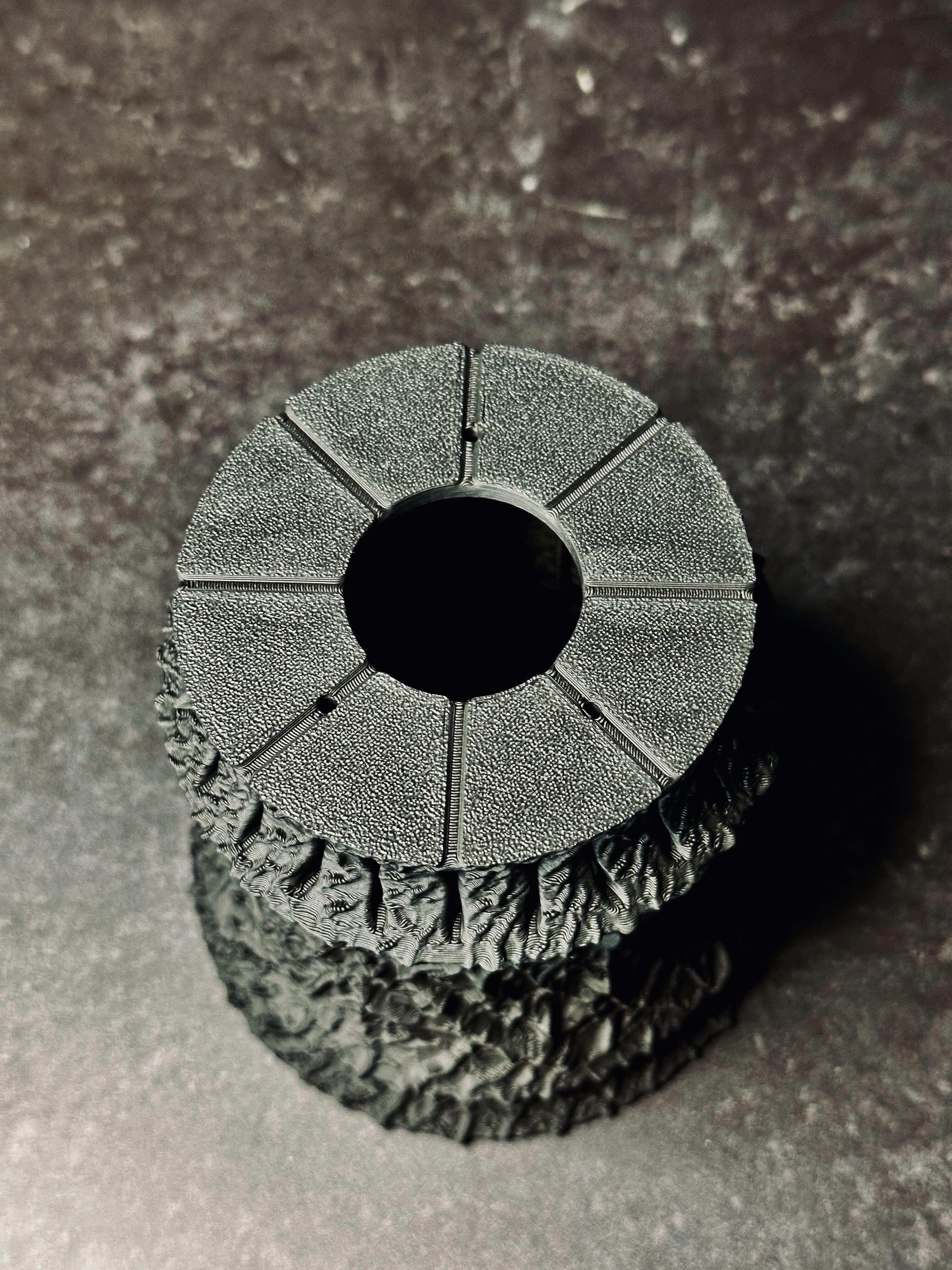 近づけば近づくほど、無数の細やかなディテールが浮かび上がり、シンプルな形状の中に秘められた複雑さを感じられる、退廃的美と生命力が交錯する作品です。