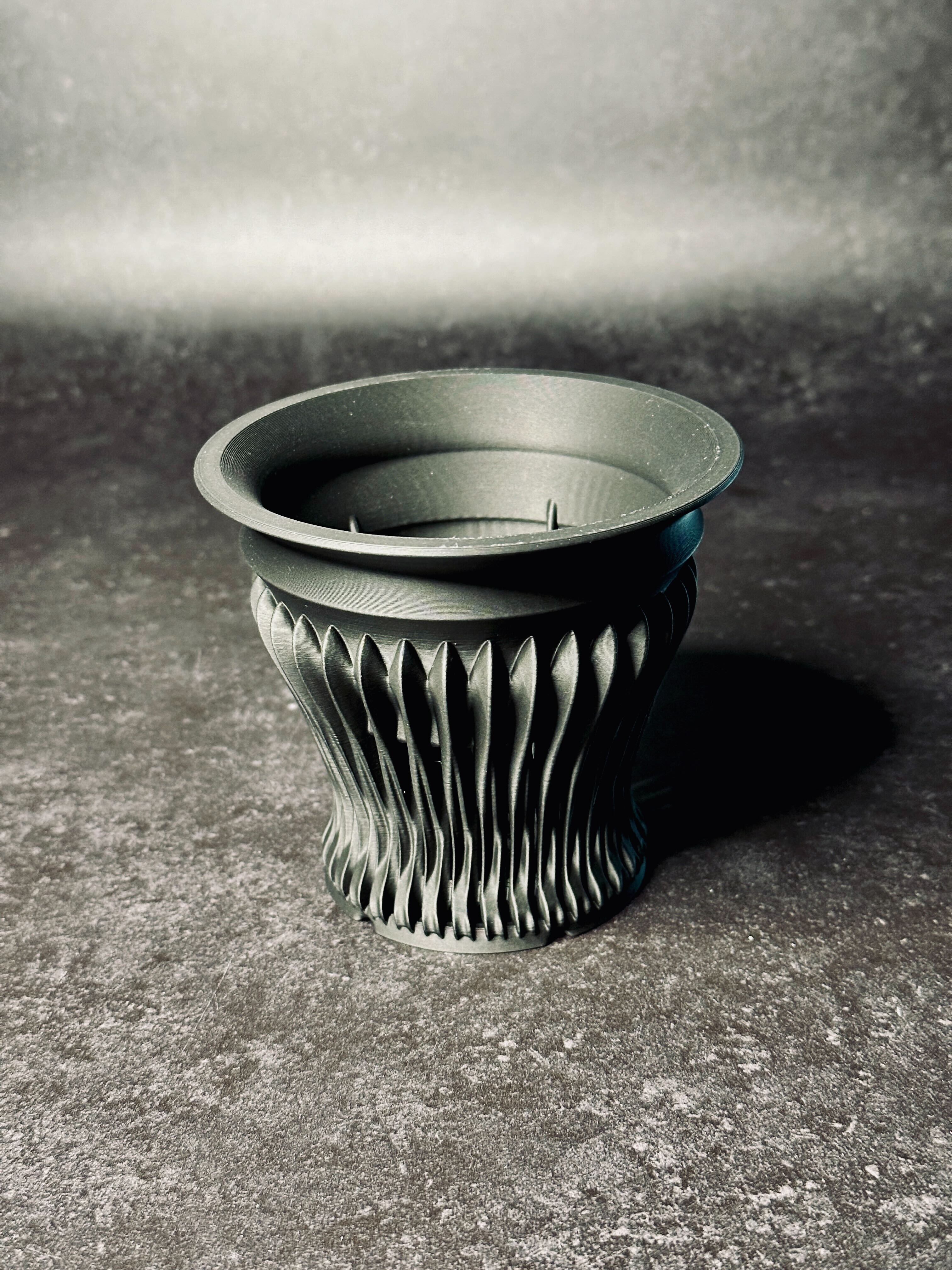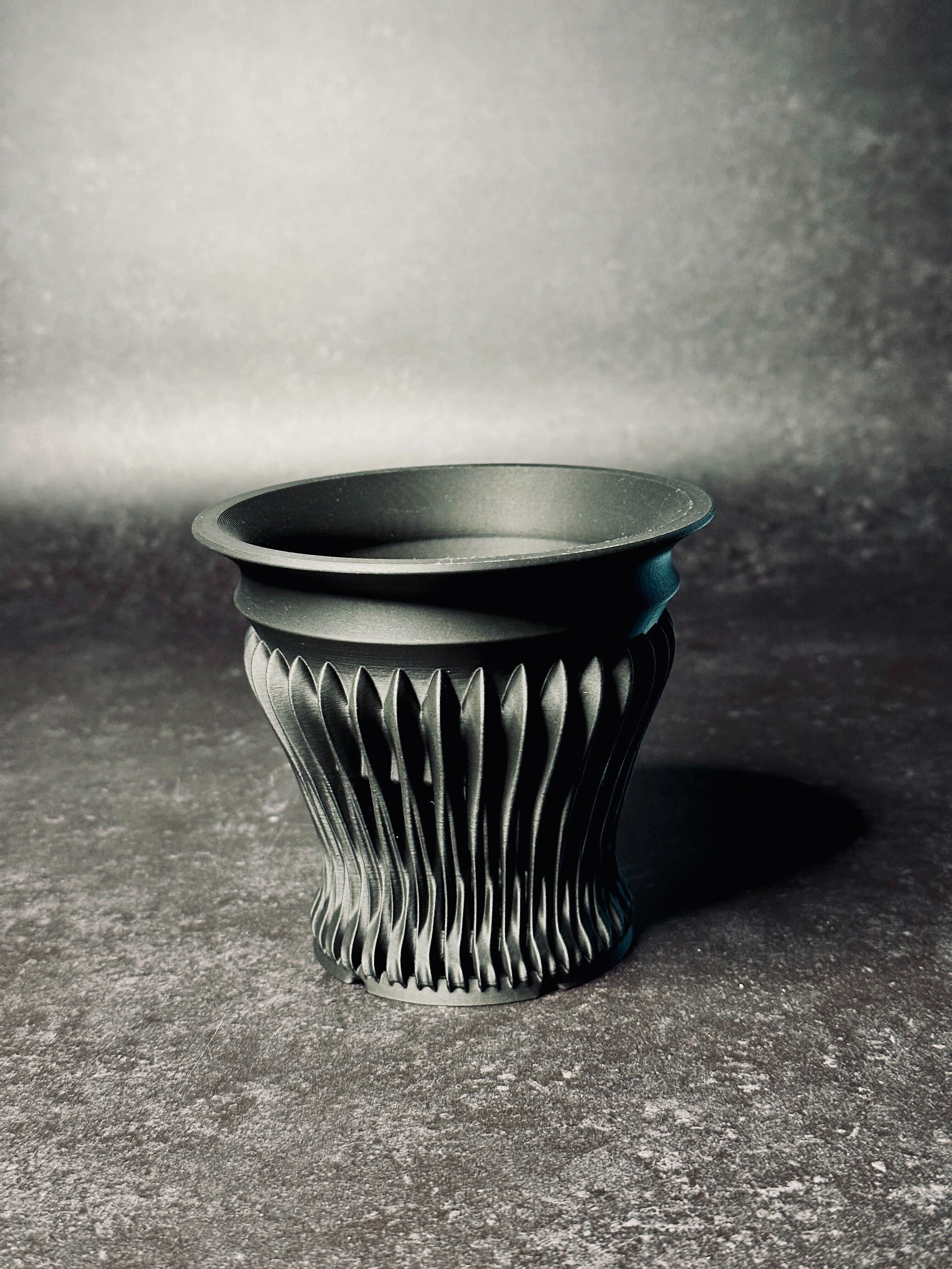 格子状のシャープな曲線が、ライトを当てることで光と影を刻み、植物の格を引き上げます。