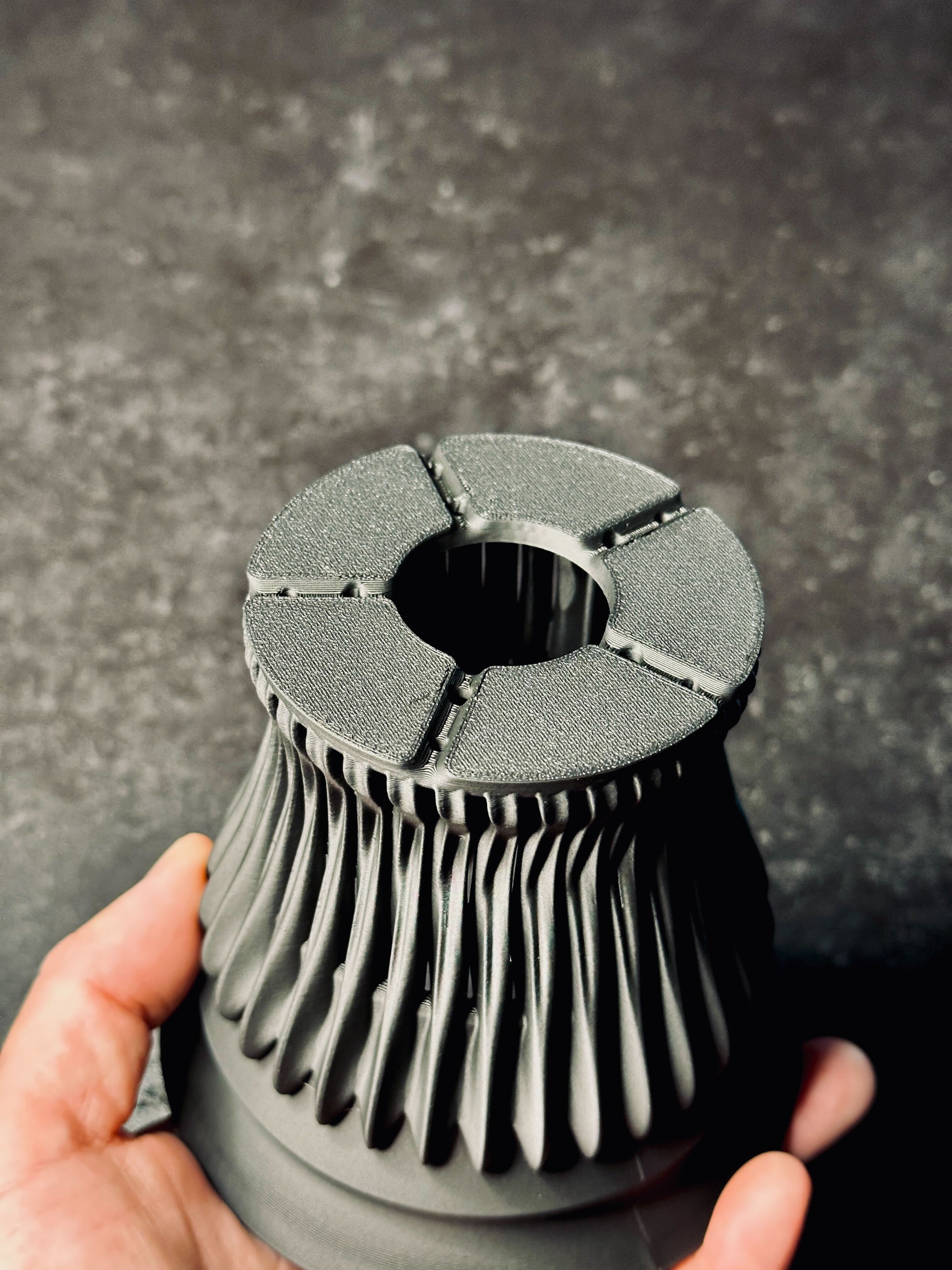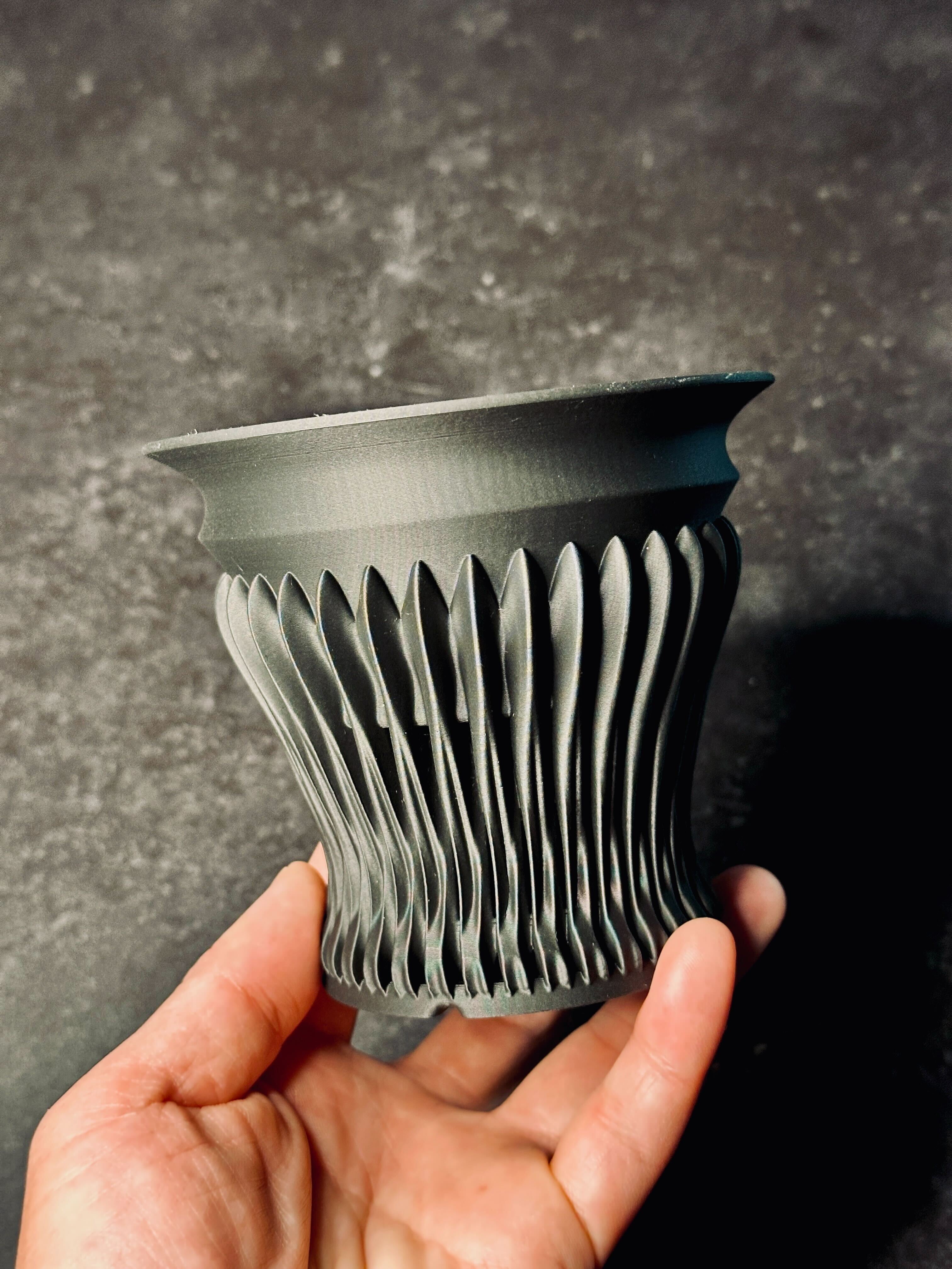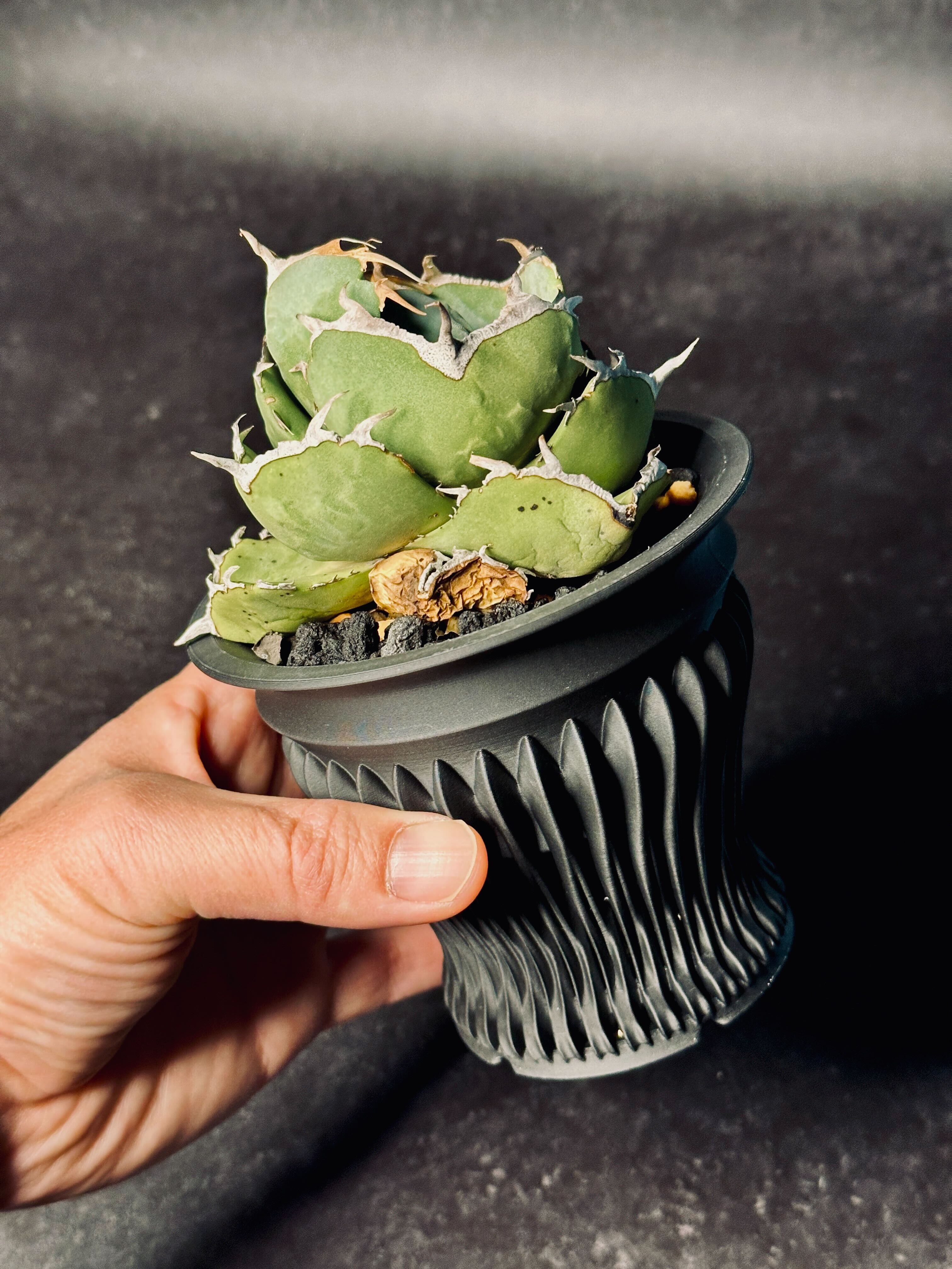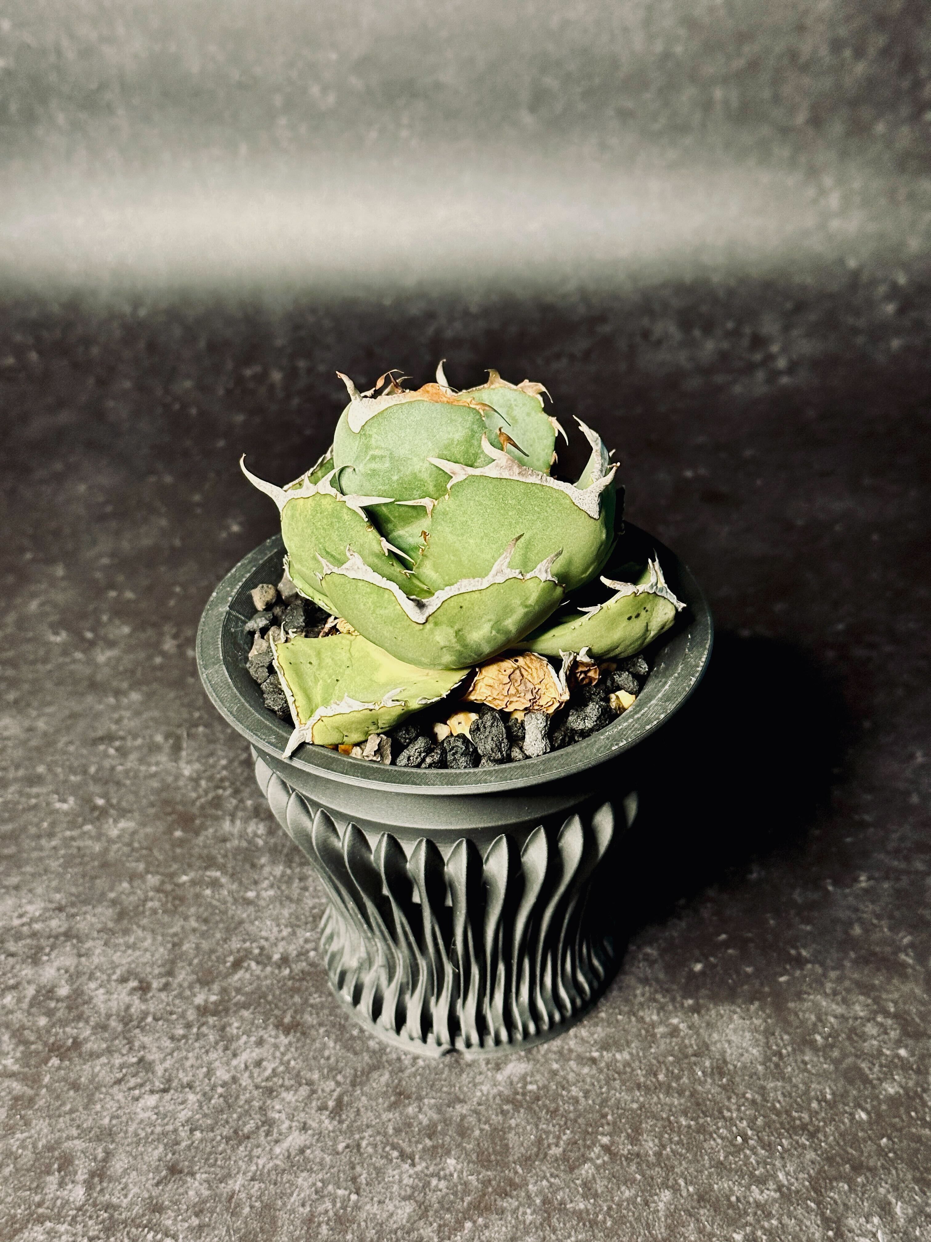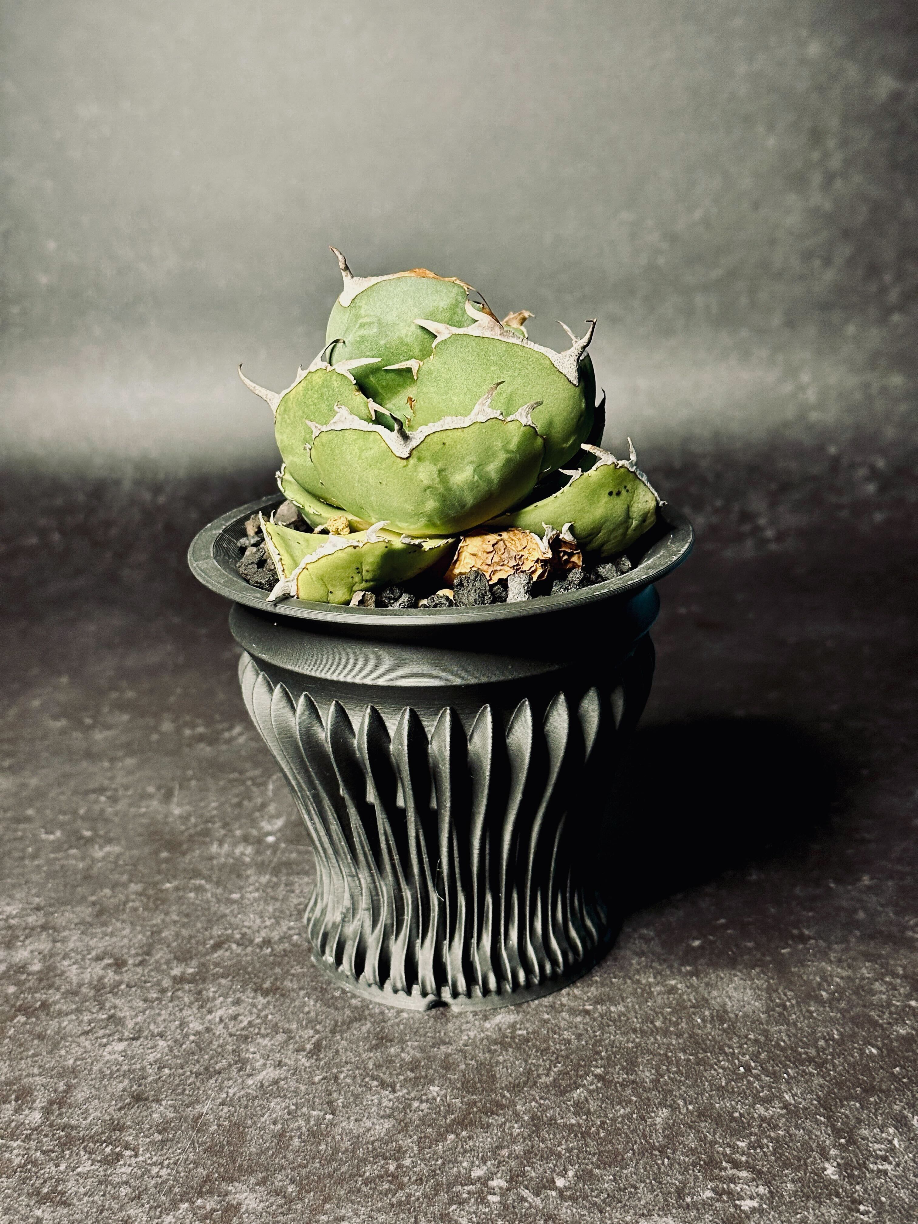 格子状のシャープな曲線が、ライトを当てることで光と影を刻み、植物の格を引き上げます。