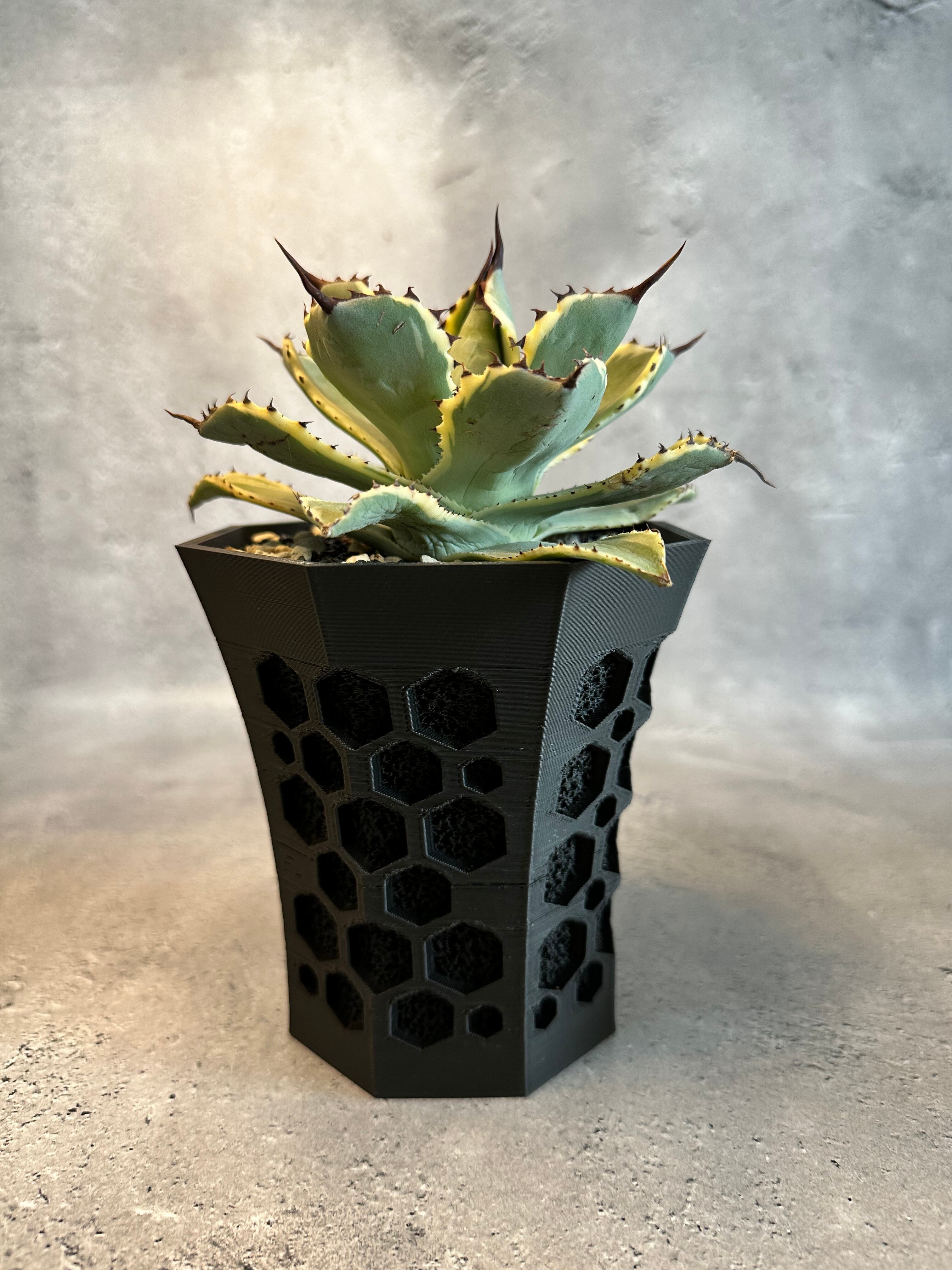 この鉢植えは、六角形と八角形が絶妙に組み合わさった独特なデザインが特徴です。